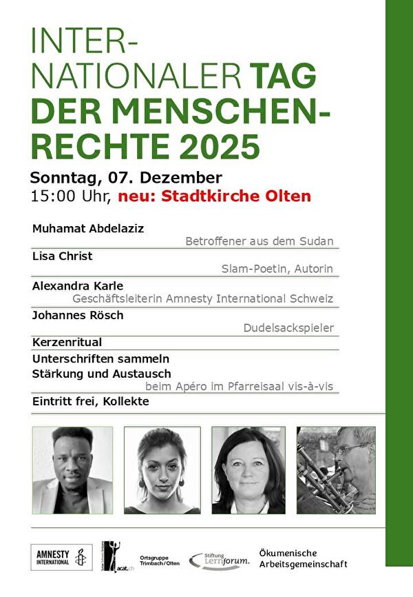 - Menschenrechte sind zentral und werden doch immer wieder mit Füssen getreten. Umso wichtiger ist es, an sie zu erinnern und dafür einzustehen. Der 10. Dezember ist der internationale Menschenrechtstag. Wir ziehen die Feier auf den vorangehenden Sonntag vor.